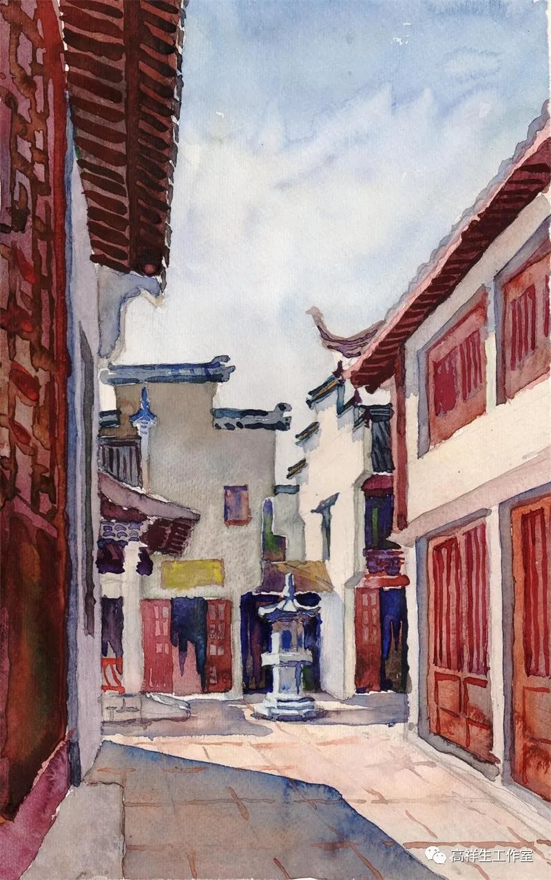 八十年代学生表现东市金陵印社的庭院的水彩画