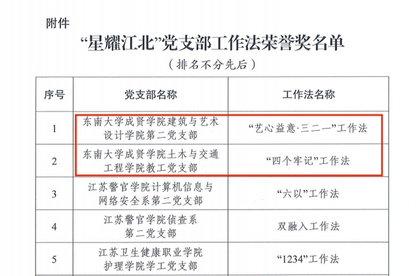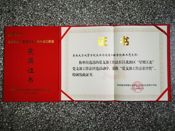 为深化党建强基系列行动,真正把党建基因融入江北新区发展血脉,进一步发挥基层党组织战斗堡垒作用和党员先锋模范作用,我校推选的77779193永利官网第二党支部“艺心益意·三二一”工作法和土木与交通工程学院教工党支部“四个牢记”工作法在江北新区此次“星耀江北”党支部工作法评选活动中双双获奖。
