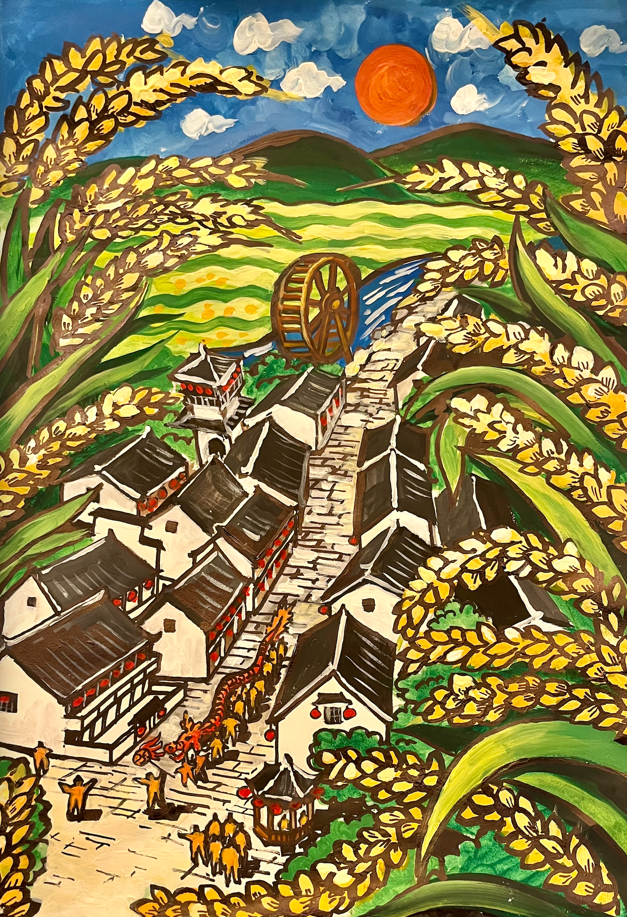 在以“美丽乡村”为主题的农民画决赛中李响老师现场创作了农民画禾下乘凉梦——新农村风貌》,其灵感来自“杂交水稻之父”袁隆平对杂交水稻高产的不懈追求画面中高大饱满的水稻为秀美的村落洒下一片清凉村民们幸福地舞起了长龙寓意以袁隆平教授为代表的仁人志士为农村的振兴和发展作出了伟大的贡献预示着农村的生活将会越来越好越来越惬意