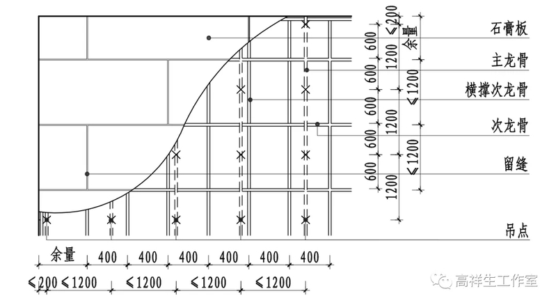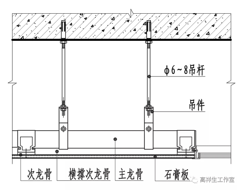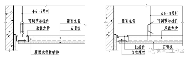 ⑤ 按承载能力分有上人式顶棚和不上人式顶棚。上人式顶棚要求有较大的强度与适当的内部空间,主龙骨要能承受 80 ~ 100 kg 的荷载,顶棚上部的空间高度应为 0.9 ~ 1.5 m。同时需预留检修孔,设具有足够强度的检修道。不上人式顶棚上部空间的高度相对较低,龙骨的荷载力亦可适当降低。