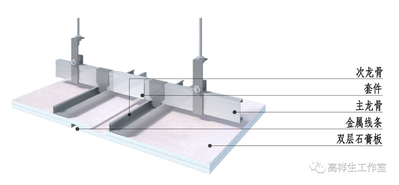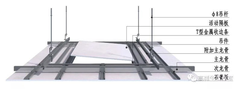 ④ 按装饰面材分,主要有石膏板顶棚、矿棉板顶棚、金属板顶棚、木质顶棚以及玻璃顶棚;