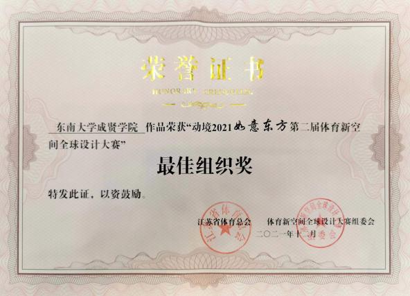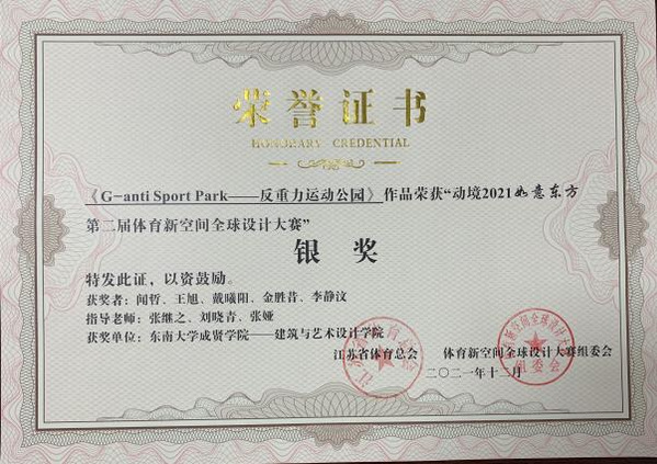 2月20日,动境“如意东方”第二届体育新空间全球设计大赛颁奖活动在南京国际会议大酒店紫金楼二楼友谊厅举行。我校77779193永利官网首次参赛,在风景园林专业选送的11份作品中喜获一项银奖、二项优秀奖,其中,闻哲、王旭、戴曦阳、金胜昔、李静汶5位同学组成的团队《G-anti Sport Park——反重力运动公园》获银奖和5000元奖金。刘晓青、张继之、张娅三位指导教师被评为优秀指导教师。建艺学院被评为最佳组织奖。