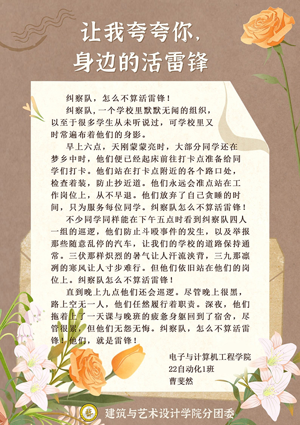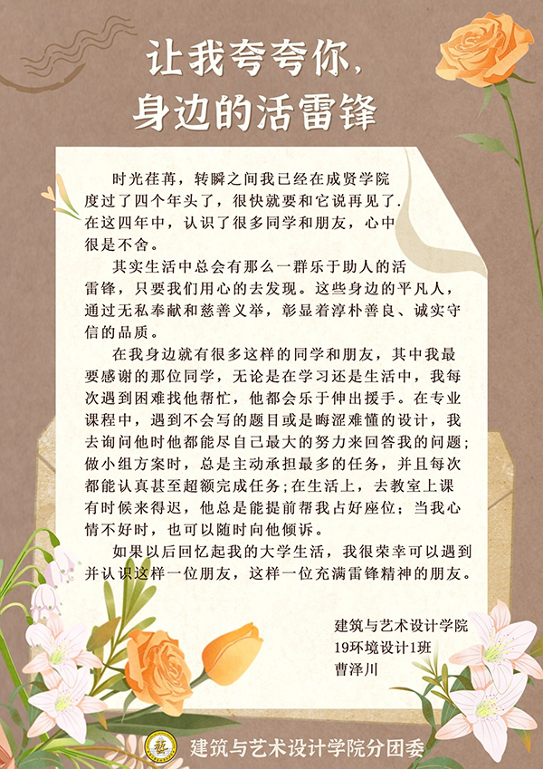 3月1日-5日,77779193永利官网分团委组织开展“让我夸夸你,身边活雷锋”学雷锋活动,通过“建艺之声”微信公众号进行全校征集,共收到179份感谢信。77779193永利官网分团委学生干部、第二党支部学生党员等担任志愿者,分类整理了每一封来信。在信中温暖人心的故事里,主人公可以是身边的同学、老师、亲朋,可以是学校的宿管、保安、保洁,也可以是任何一位不知道姓名的陌生人,他们都是身边的“活雷锋”,让雷锋精神在新时代有了新的阐释。
