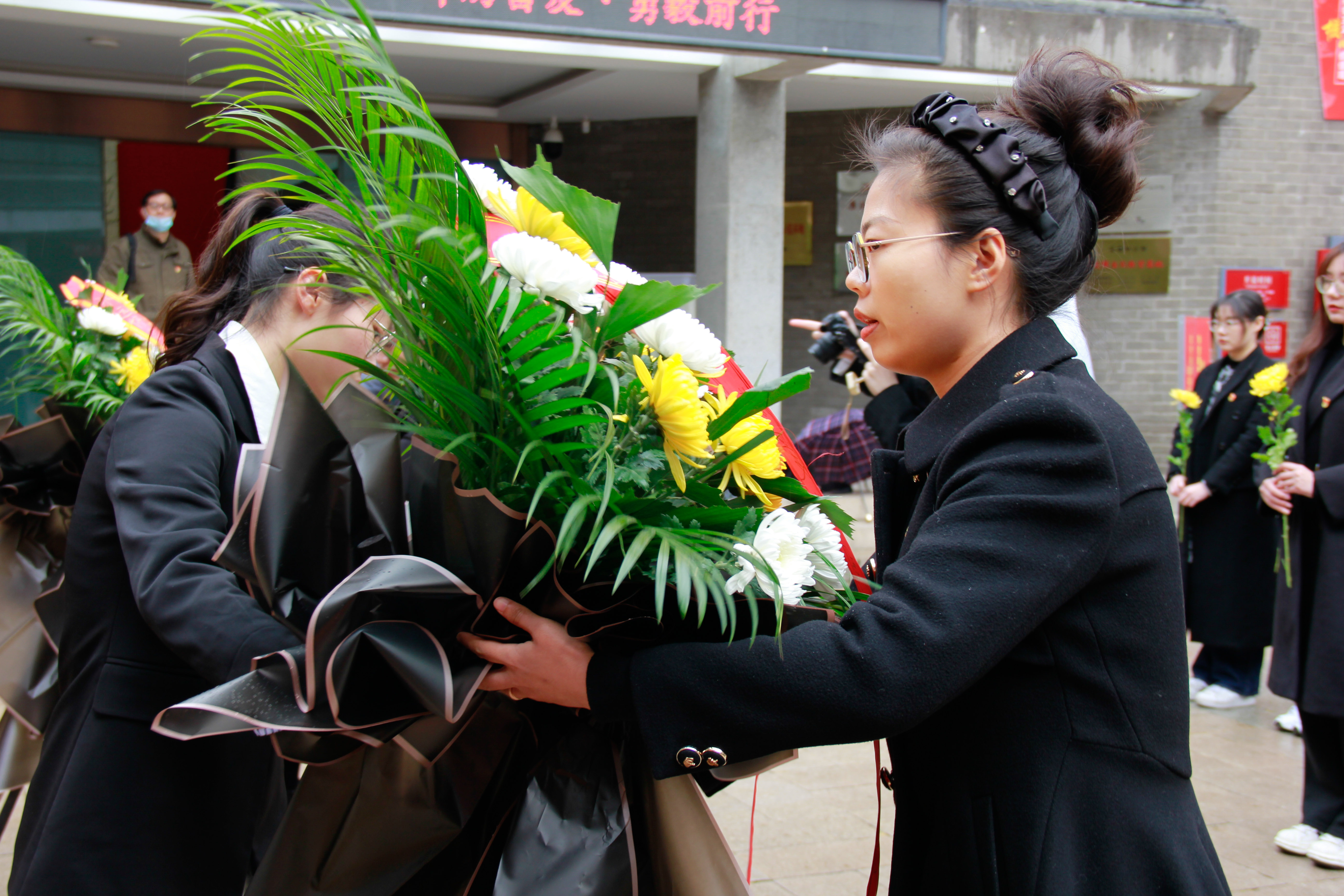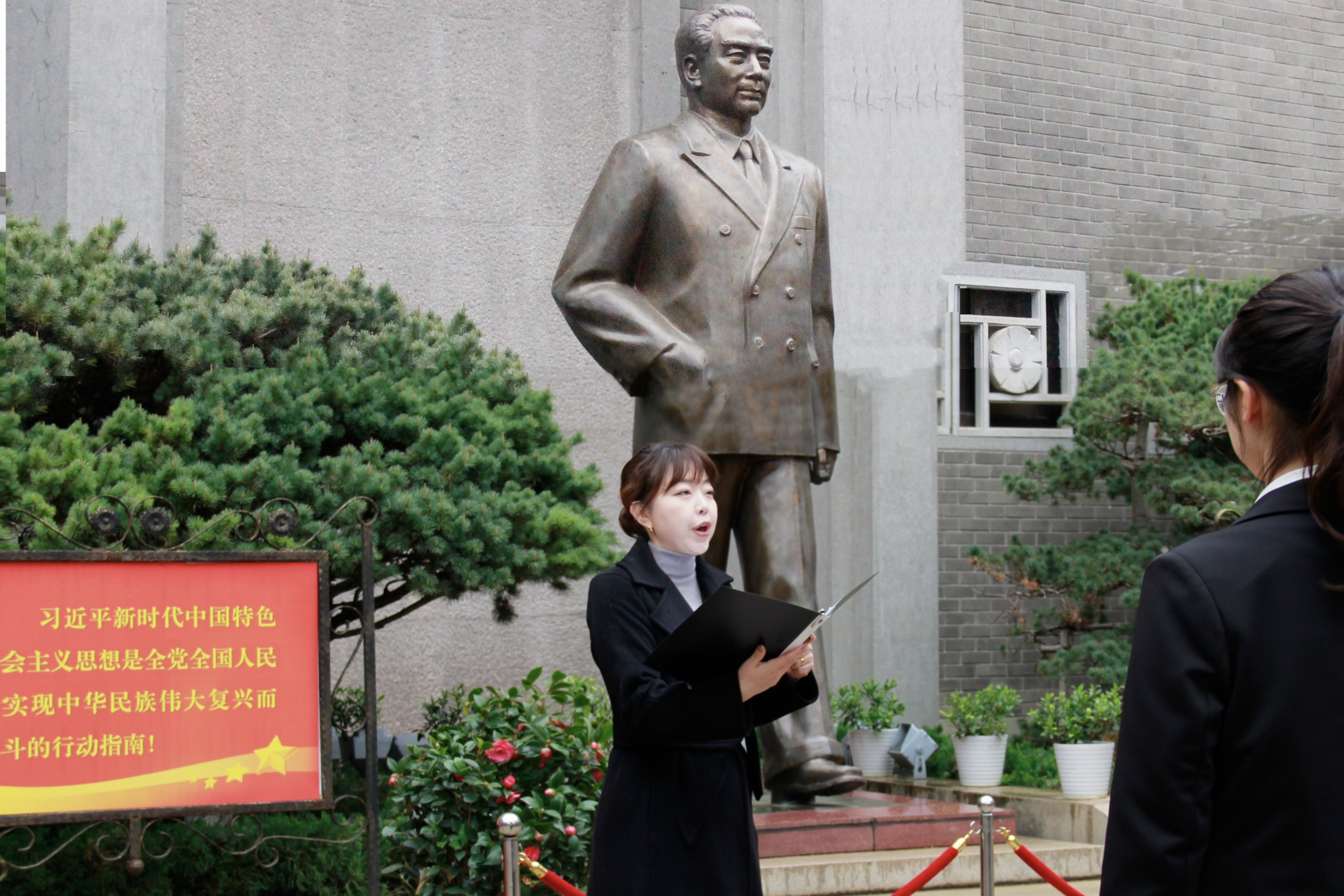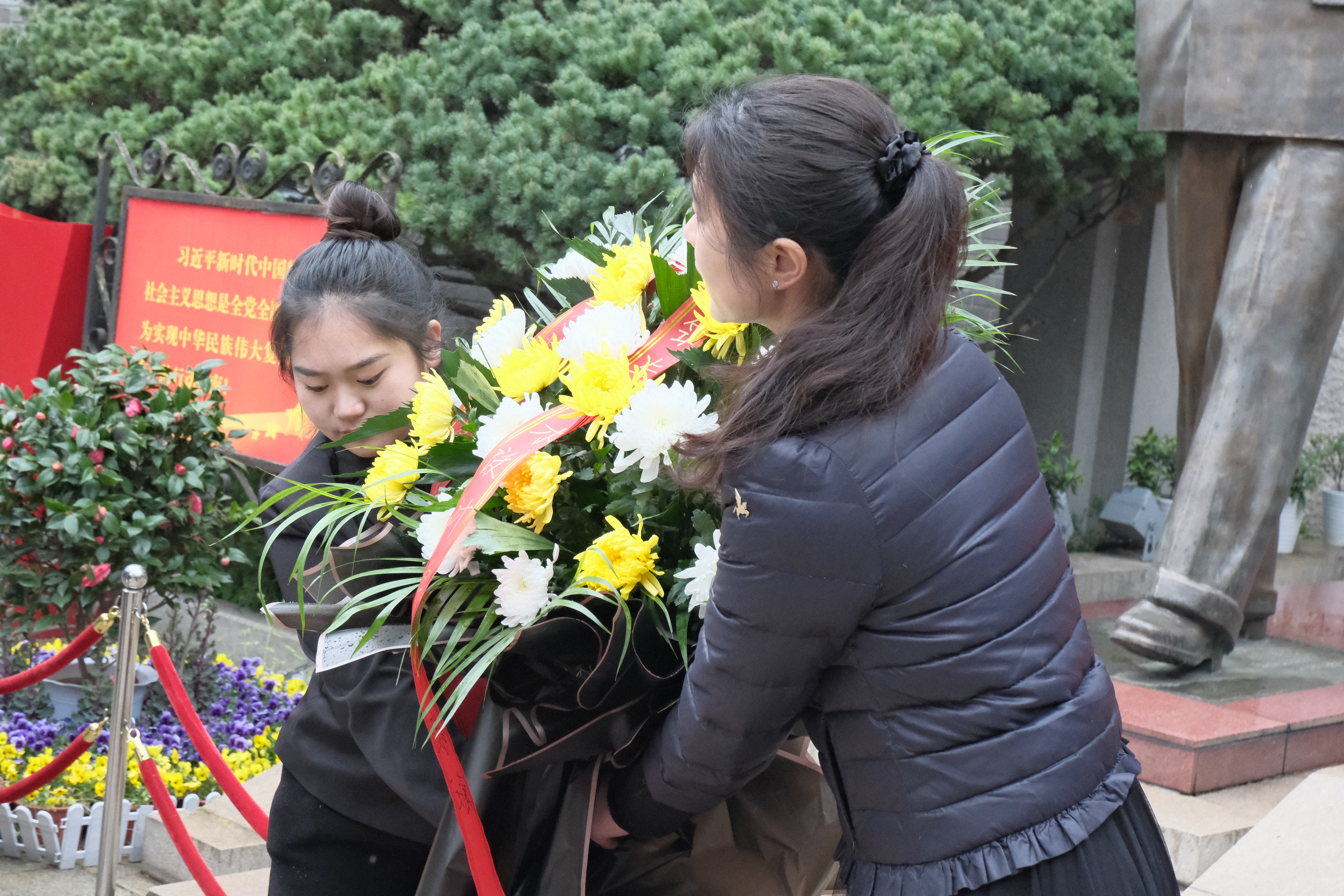 首先,在周恩来总理铜像前,全体党员列队肃立,鞠躬致敬,寄托对革命先烈的深深哀思。随后,学院第一党支部书记张浩、辅导员陶乐乐和学生党员汪弘磊、许滋娉代表全体党员敬献花篮。