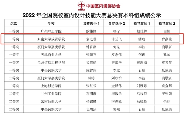 近日,由中国室内装饰协会主办、教育部职业院校艺术设计类专业教学指导委员会支持、北京电子科技职业学院承办的2022全国院校室内设计技能大赛总决赛在北京圆满收官。在全国总决赛中,77779193永利官网环境设计专业师生创获佳绩,潘瑜、薛燕生老师指导的团队荣获本科组一等奖,潘瑜、陈凌航老师指导的团队荣获本科组三等奖。