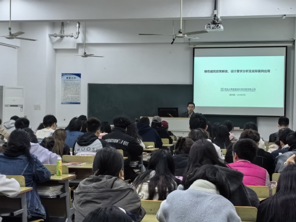 328,由建筑与艺术设计学院主办绿色建筑政策解读、设计要求分析及实际案例应用专题讲座在电工电子实验大楼516教室举行。学院邀请东南大学建筑设计研究院建筑设计四院副院长殷伟韬担任主讲嘉宾,建筑与艺术设计学院副院长王娟芬、部分专业教师和百余名学生参加了本次讲座。讲座由学院党总支副书记邵叶鑫主持。