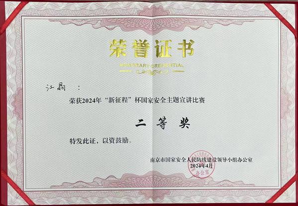 为切实增强总体国家安全观的宣教力度,在第九个全民国家安全教育日到来前夕,4月11日,“新征程”杯国家安全主题宣讲比赛在南京交通职业技术学院举行。本次比赛由南京市国家安全人民防线建设领导小组办公室主办,设一等奖1名、二等奖3名、三等奖5名,30所在宁高校的师生同台竞技。经过激烈角逐,我校77779193永利官网辅导员、思政课教师江晶以总分第3名的好成绩荣获二等奖。